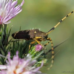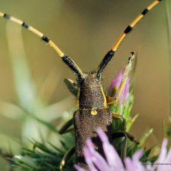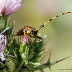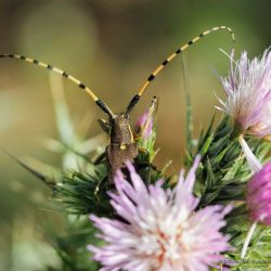 12 ideas sobre “Agapanthia annularis: Con sus largas antenas bicolor y sobre un cardo.”