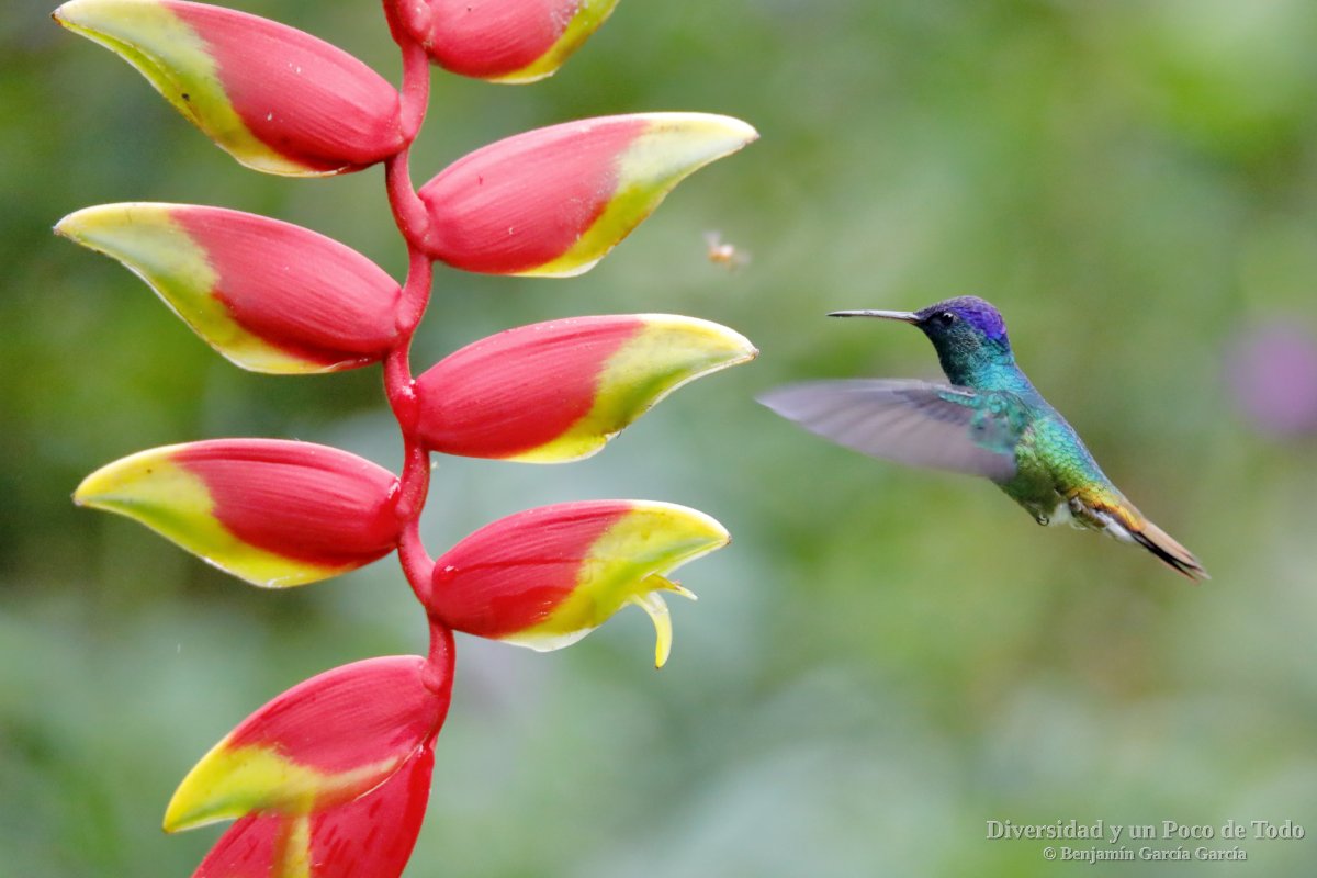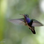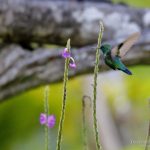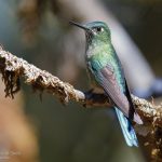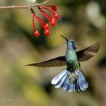 –Colibrí rutilante, Sparkling Violetear (Colibri coruscans). Especie de amplia distribución andina, desde el sur de Venezuela al norte de Brasil. Se encuentra en ambientes abiertos y bordes de bosque, desde los 1700 a 4500 m.