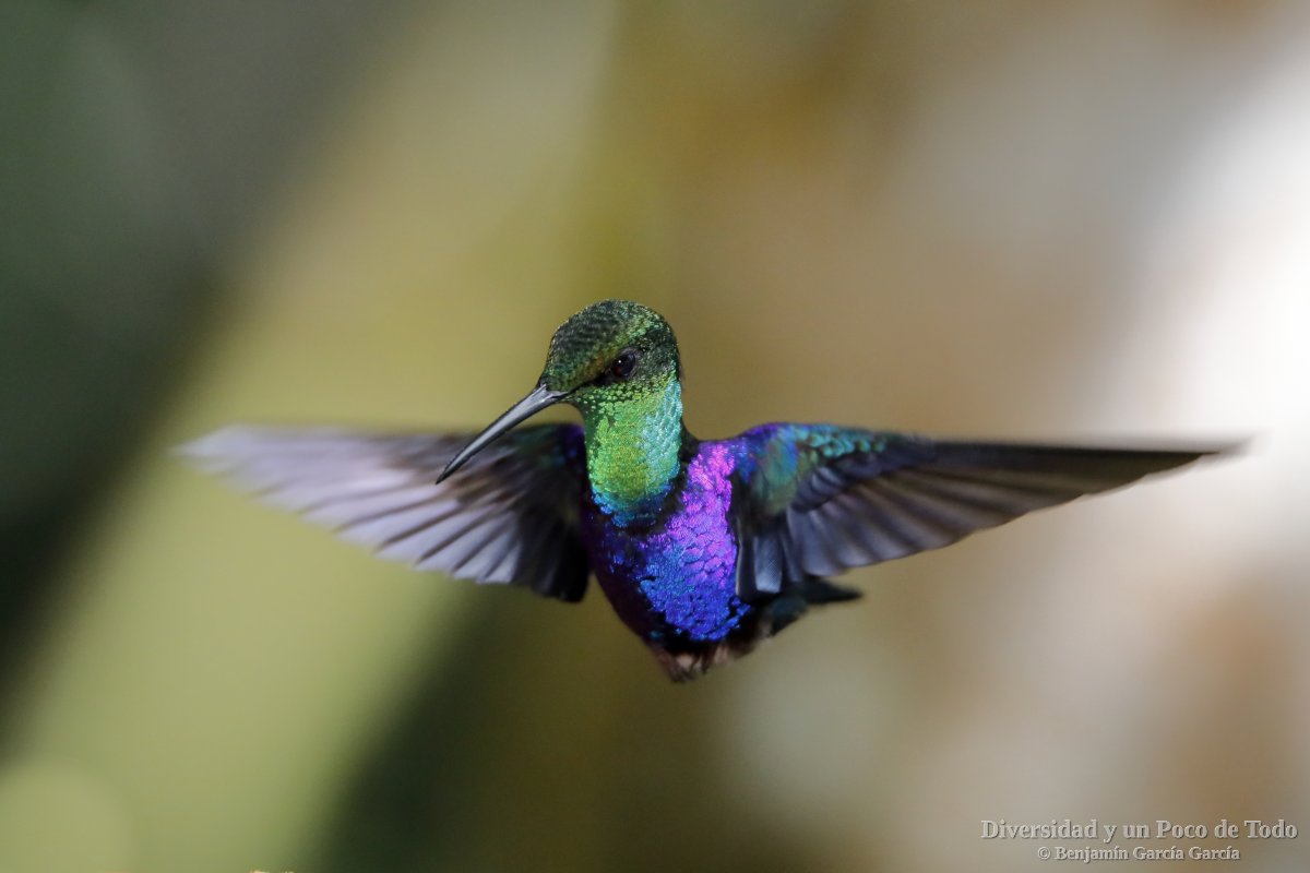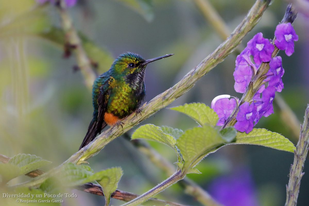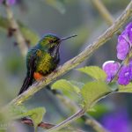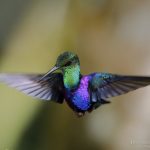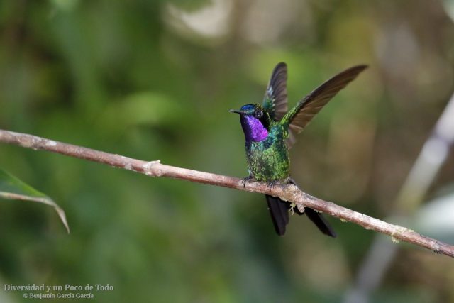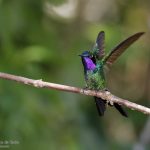 -Colibrí violeta, Purple-throated Sunangel (Heliangelus viola). Se encuentra en Ecuador y Perú donde vive en una amplia gama de hábitats, desde bosques nubosos hasta matorrales arbustivos y bosques de Alnus, y a altitudes de 2150 a 3000 m.