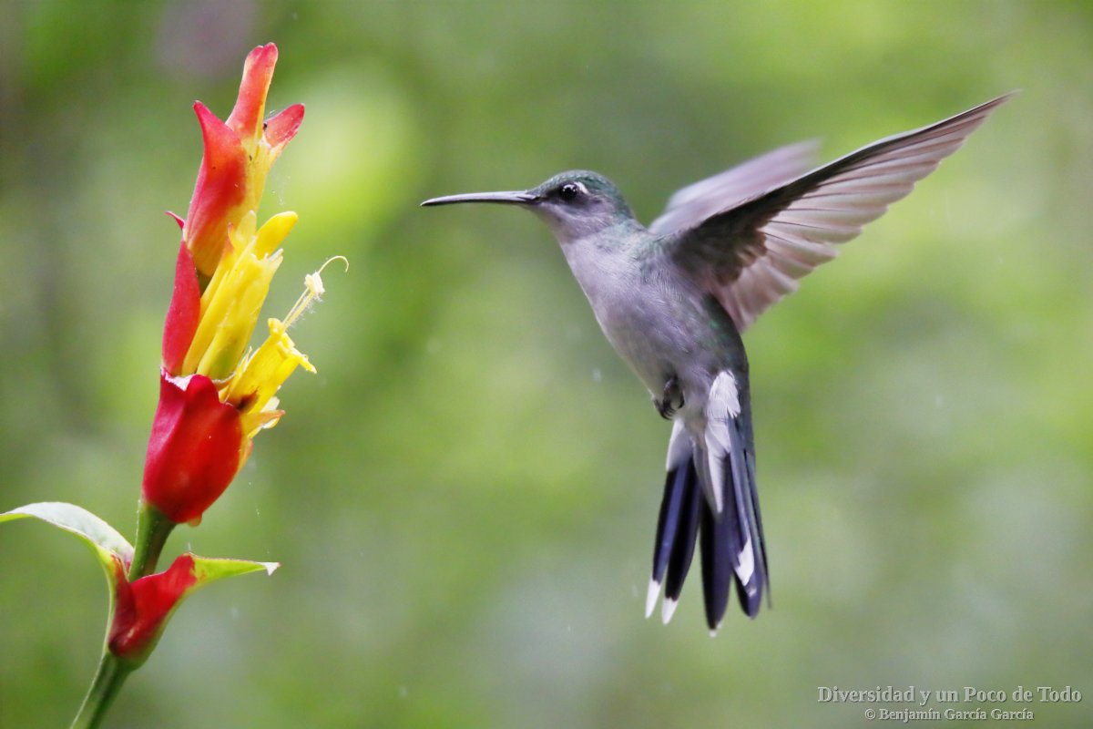-Colibrí piquilargo, Long-billed starfrontlet (Heliomaster longirostris). Especie de amplia distribución desde el sur de México, Centroamérica y hasta Bolivia y Brasil. Habita en bosques abiertos, pastizales con árboles aislados, bosques de galería y vegetación de segundo crecimiento. Se encuentra desde las tierras bajas y pies de monte hasta los 1500 m.