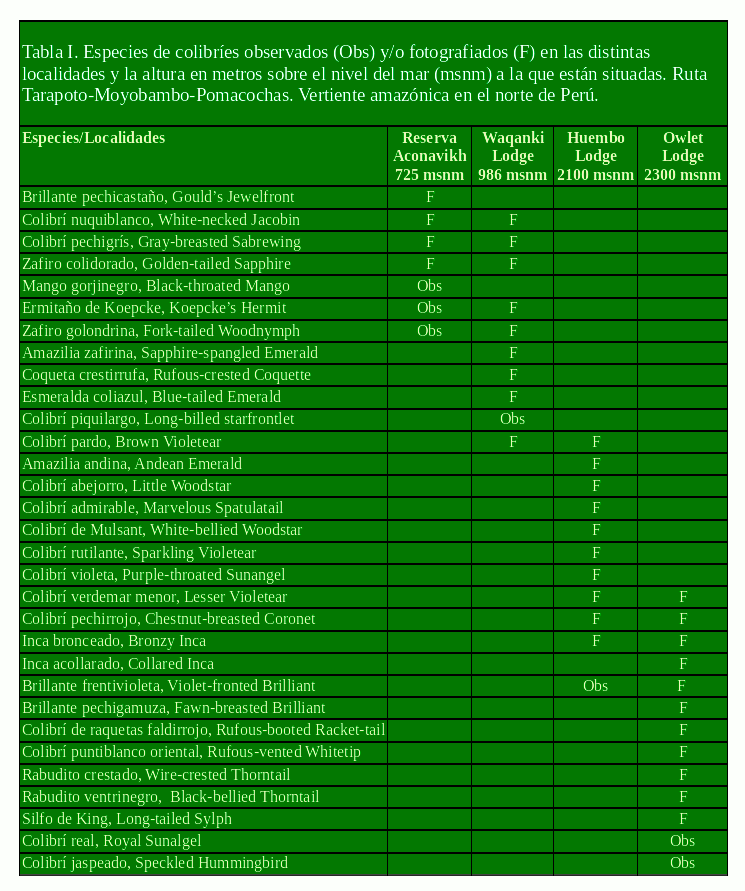 En este artículo se muestran las especies de colibríes que observamos y/o fotografiamos a lo largo de la ruta en la Reserva Aconabikh y distintos establecimientos de alojamiento (Waqanki, Huembo y Owlet Lodge) y zonas adyacentes (ver Tabla I). Las distintas especies se han agrupado en función de la altura sobre el nivel del mar en la que se encontraban y, también, en relación a la distribución geográfica de cada una de ellas respecto a la vertiente oriental amazónica de los Andes.