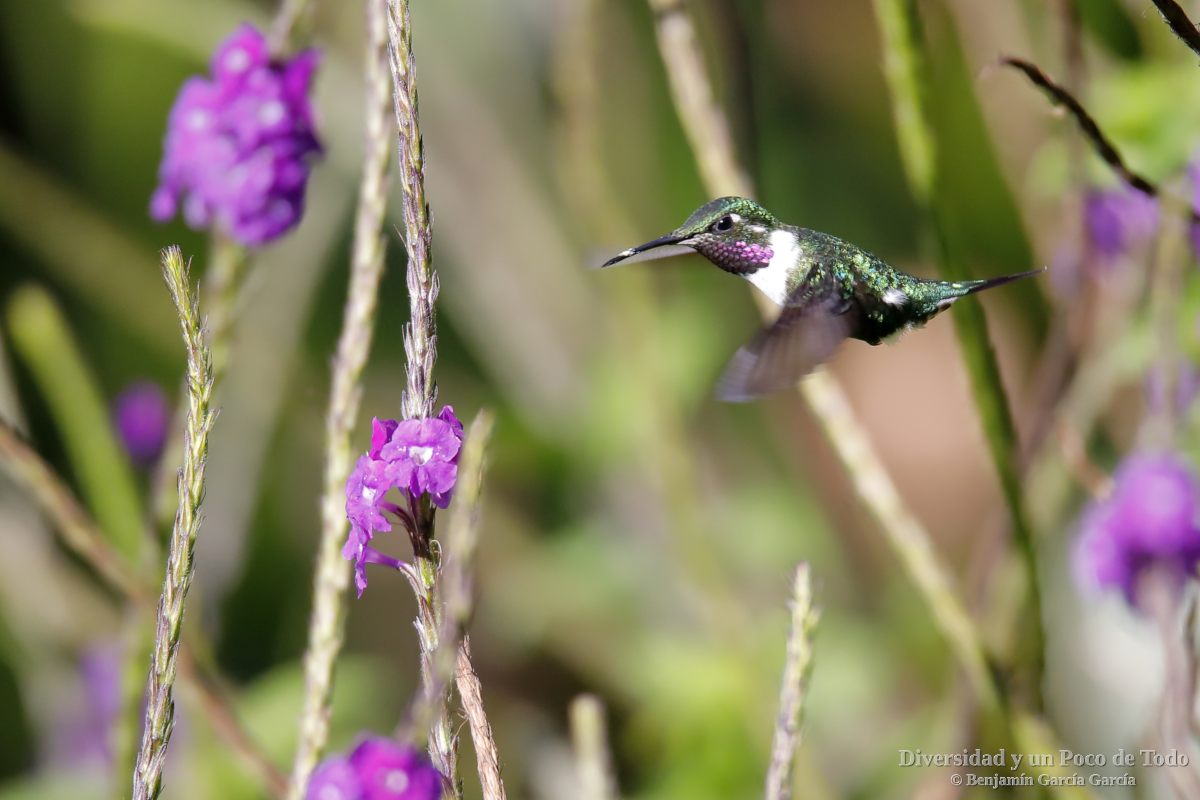 –Colibrí de Mulsant, White-bellied Woodstar (Chaetocercus mulsant). Se encuentra en Colombia, Ecuador, Perú y Bolibia. Habita en los bordes de bosques húmedos, matorrales, prados de las tierras altas y, también, en áreas de cultivos y jardines. 1500-2800 m.