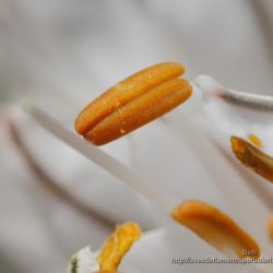 El androceo de Asfodelus fistulosus esta formado por 6 estambres (6-9 mm), cuyo filamento está engrosado en la base y es de color blanco. Las anteras (1,5-2,5 mm) son de color naranja o pardo anaranjado. El gineceo presenta un ovario súpero. Es decir que está situado por encima del cáliz. El estilo es tan largo como los estambres; y el estigma presenta lóbulos para retener el polen que por el estilo alcanzará el ovario. En algunas fotografías los lóbulos del estigma aún no están formados y los estambres rebosantes de polen tienen un intenso color naranja. En las fotografías en las que los lóbulos son patentes y ya están atrapando polen presentan las anteras algo deshinchadas y con un tono de color más pardo.