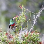 Harold Porter National Botanical Gardens está localizado a unos 5 km al este de Stony Point Nature Reserve, y forma parte de la Reserva de la Biosfera de Kogelberg. Como la mayoría de los jardines es un buen lugar para pajarear; las aves están acostumbradas al ser humano. Aquí, y a pesar de la poca luz como se indica en la introducción, pude fotografiar a el suimanga acerado (Southern Double-collared Sunbird; Cinnyris chalybeus), papamoscas fiscal (Fiscal Flycatcher; Melaenornis silens), zorzal oliváceo (Olive Thrash; Turdus olivaceus) y cuclillo de Klas (Klaas’s Cuckoo; Chrysococcyx klaas).