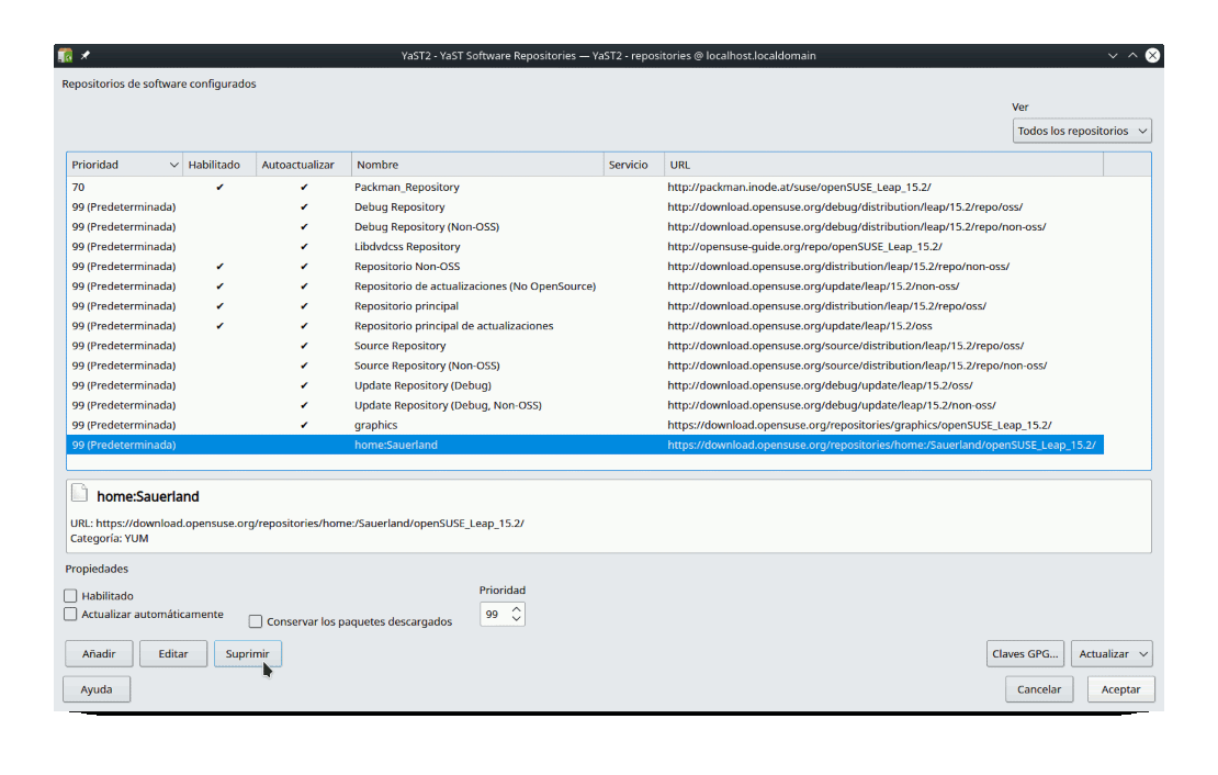 Durante el proceso anterior se habrá añadido a las fuentes de software el repositorio “home:Sauerland”, pero ya no lo necesitamos. Así que lo suyo es deshabilitar dicho repositorio o incluso suprimirlo; además así evitaremos problemas posteriores de incompatibilidades. Para ello vamos a: