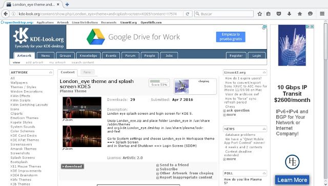 Otros temas podemos conseguirlos en KDE-Look.org en su sección Artwork, aquí encontraremos en Plasma Themes, KDM Themes y Splash Screens temas de pantalla de inicio de sesión y de bienvenida. Los descargamos; son paquetes tar.gz, tar.lzma, o .zip que descomprimimos y las carpetas que contienen las tenemos que poner en dos lugares distintos según sean temas de una u otra pantalla. Concretamente: