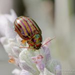 Chrysolina americana pertenece a la familia de los escarabajos de las hojas (crisomélido) que, como su nombre indica, son fitófagas; esta especie en concreto de labiadas aromáticas. También pertenece a esta familia, y al mismo género, el escarabajo de la menta (Chrysolina herbacea) que vimos en un artículo anterior. Si aquella es bella, esta no se queda atrás.