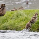 Por otro lado, y al menos cuando estuvimos, en la desembocadura había una colonia reproductora de charran ártico, que como es su costumbre se mostraron muy agresivas con los intrusos. Y, también, un grupo de hembras de eider común custodiando a las polladas de esa temporada.