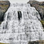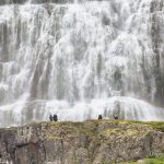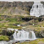 Dynjandi significa “atronador” y no es para menos. La cascada está formada por una serie de siete saltos; tiene una altura total de 100 metros, cerca de 30 de ancho en la parte más alta, y de 60 en la base. El primer salto es el de mayor altura y el más espectacular. Desde la base el agua fluye hasta desembocar en el fiordo atravesando otros seis saltos más pequeños pero que contribuyen también a que el paisaje en su conjunto sea espectacular. De hecho, se considera una de las cascadas más impresionantes y atractivas de Islandia. El visitante puede acceder hasta la parte inferior de la cascada por un camino escalonado hecho con tablones. Y aquí es donde realmente se siente el atronador sonido del agua, así como las salpicaduras del agua pulverizada.