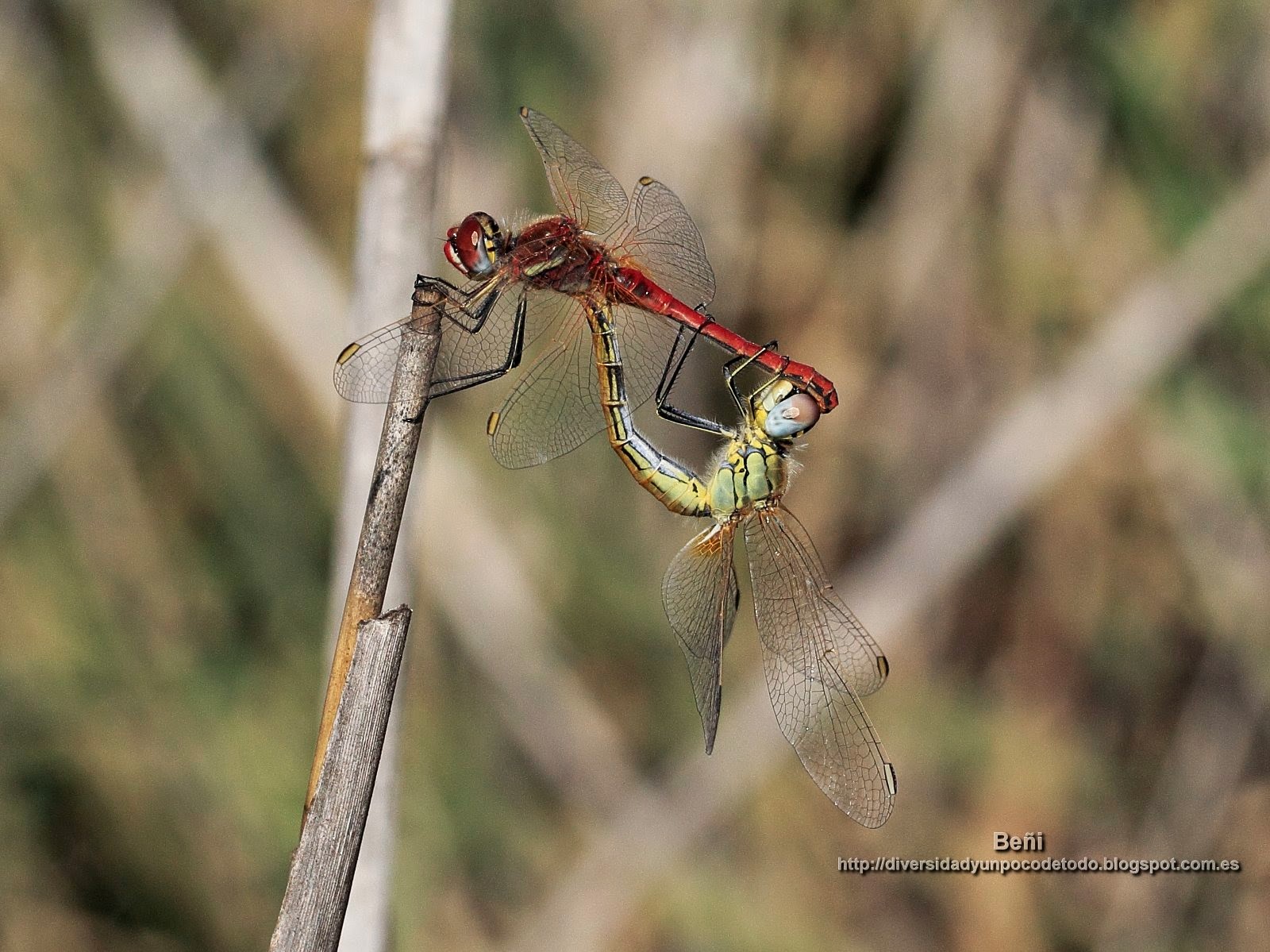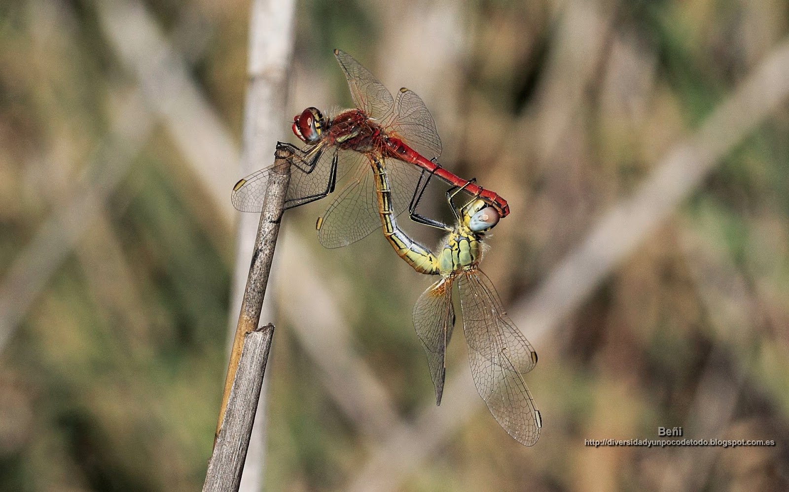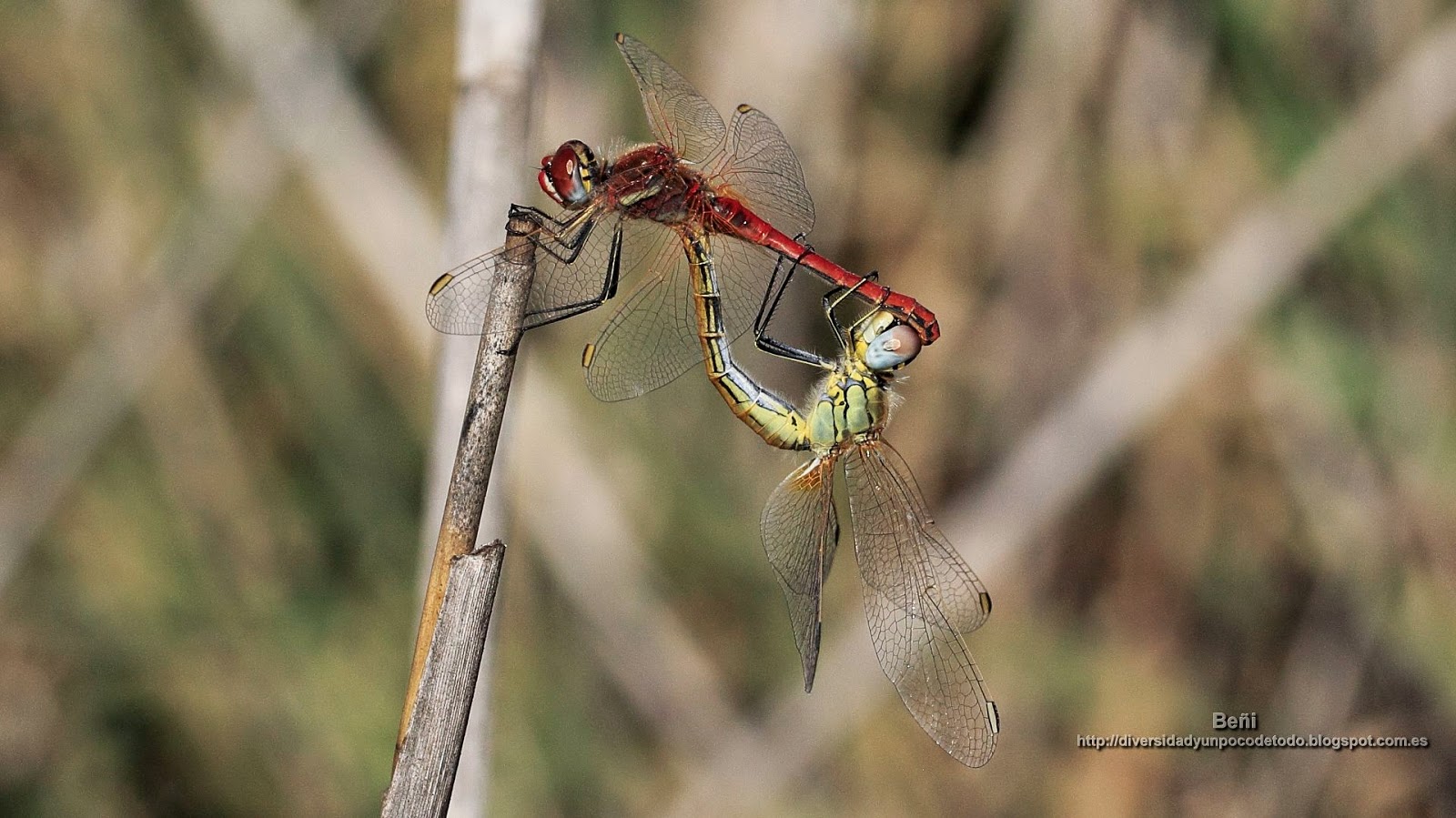 2 ideas sobre “Fondos de pantalla o wallpapers. Naturaleza. La libélula Sympetrum fonscolombii en posición en tandem o de apareamiento.”