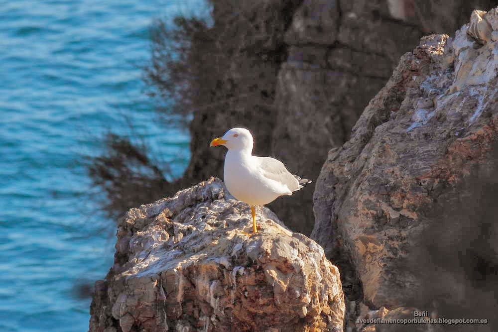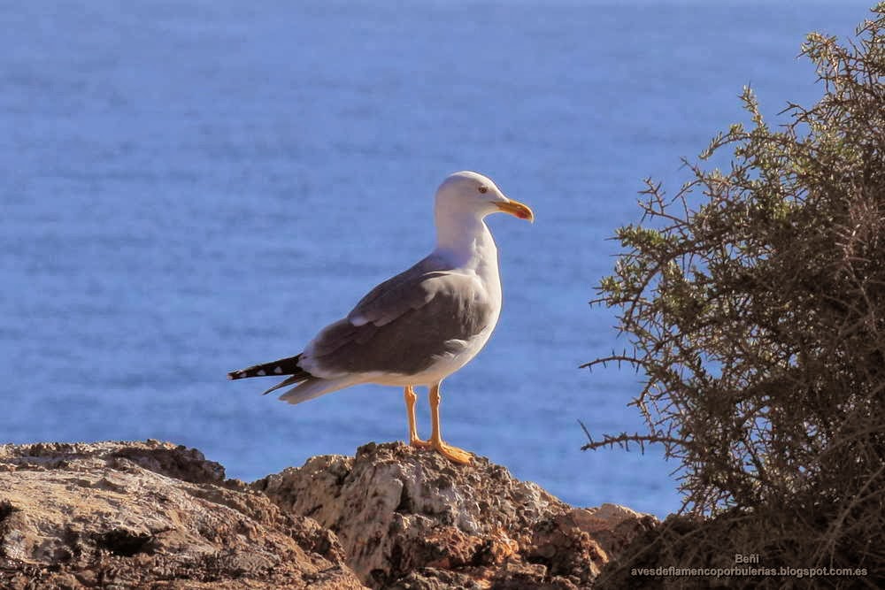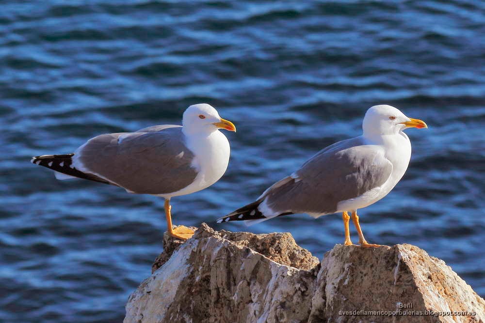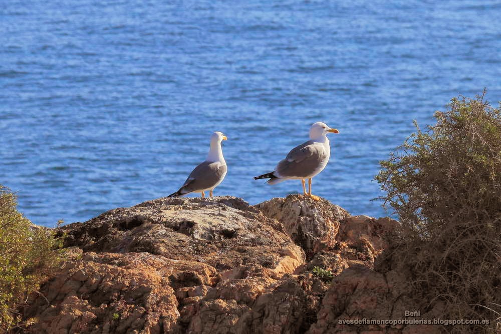 Todos los ejemplares que aparecen en las fotografías deben ser adultos de 3er y 4º invierno. En el acantilado había también juveniles que tienen el pico negro y el plumaje moteado, pero no se pusieron a tiro de cámara; en la fotografía de la colonia hay algunos ejemplares a la derecha. Para más detalles en imágenes sobre los cambios de plumaje y del color del pico y patas se puede consultar el siguiente enlace (Guía visual de gaviotas: gaviota patiamarilla mediterránea).