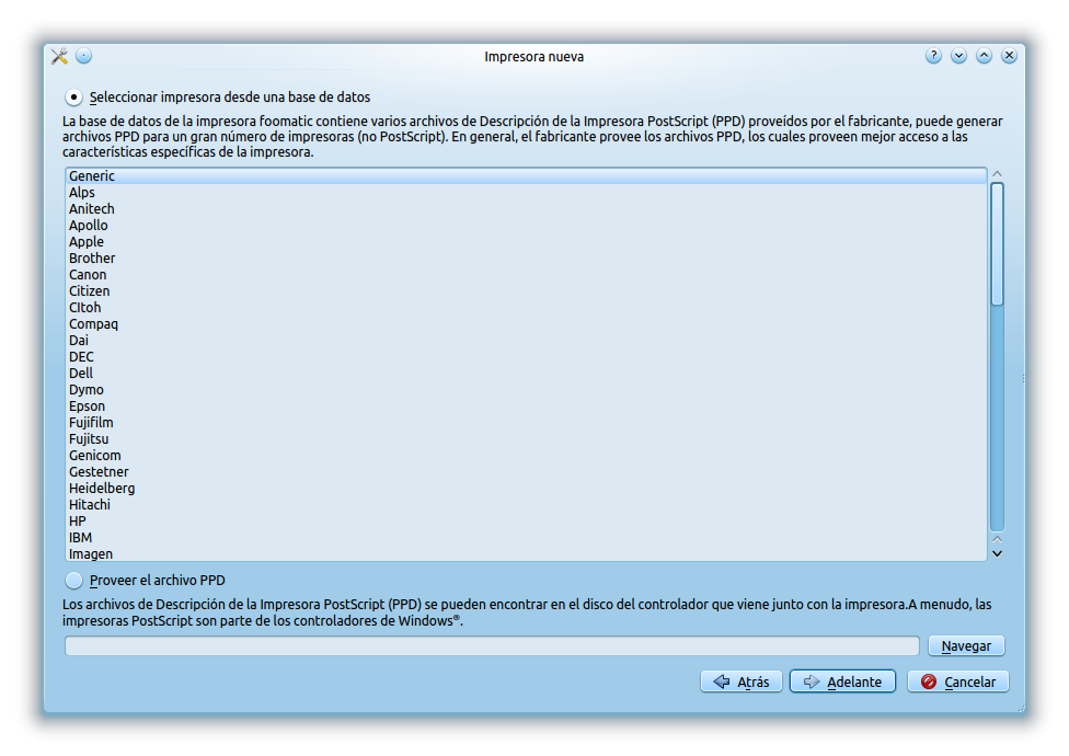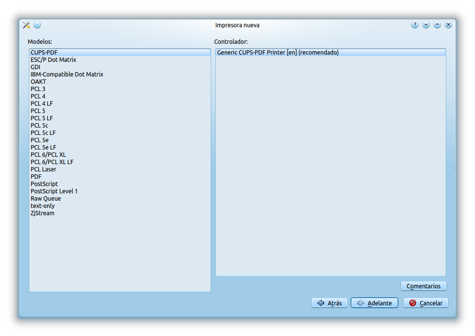Se abre un ventana, a la izquierda marcamos “Impresora nueva” y a la derecha picamos en “Impresora nueva”. Se abre otra ventana y marcamos en “CUPS-PDF” y picamos “siguiente”. Se abre otra ventana y marcamos en “generic”; en la siguiente ventana en “Modelos” (a la izquierda) marcamos CUPS-PDF y en “Controlador” (a la derecha) el que recomienda (Generic CUPS-PDF Printer). Y nuevamente picamos adelante.