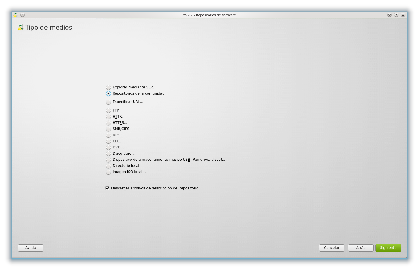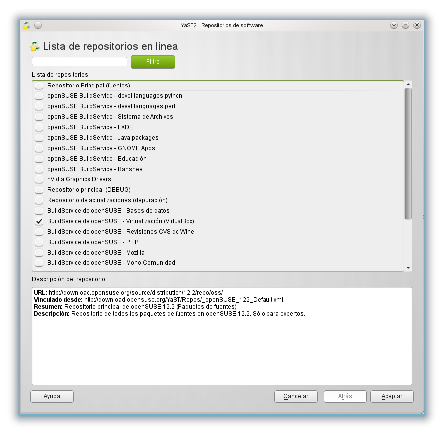 Picamos en añadir, en la ventana siguiente marcamos “Repositorios de la comunidad”, marcamos BuldService de openSUSE-Virualización (VirtualBox), y “Aceptar”. Si no nos sale el mensaje de error que mencionaba antes seguimos las indicaciones anteriores a.1), a.2) y a.3).