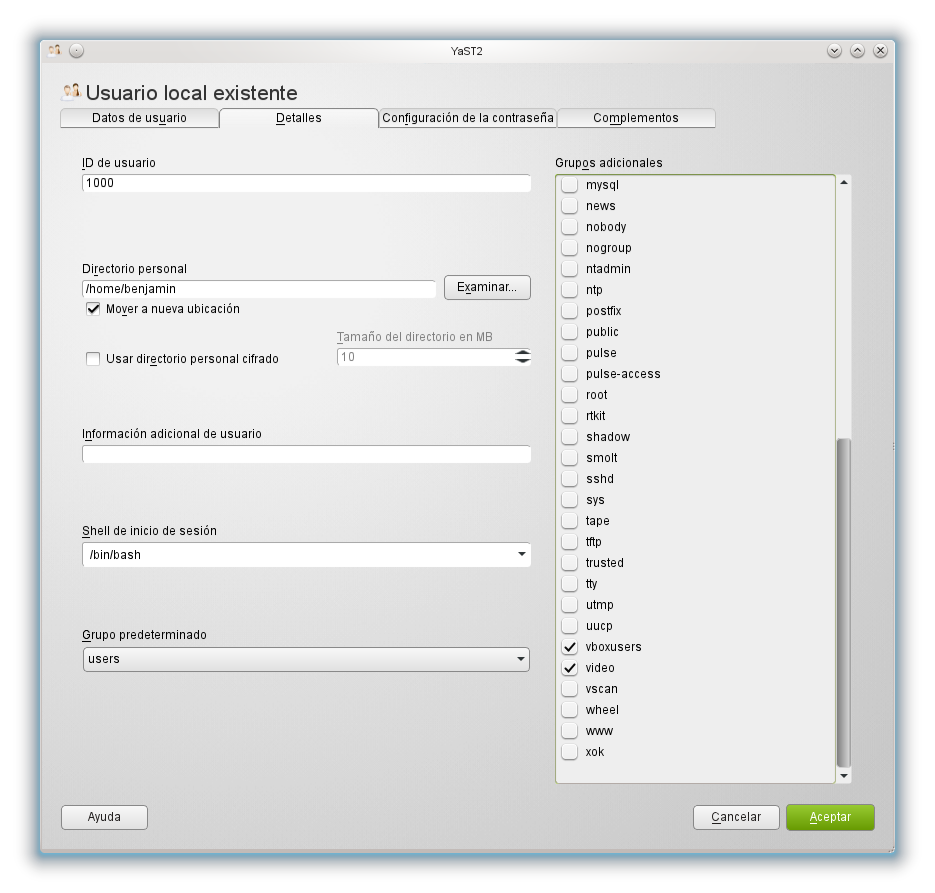YaST>Seguridad y usuarios>Gestión de usuarios y grupos