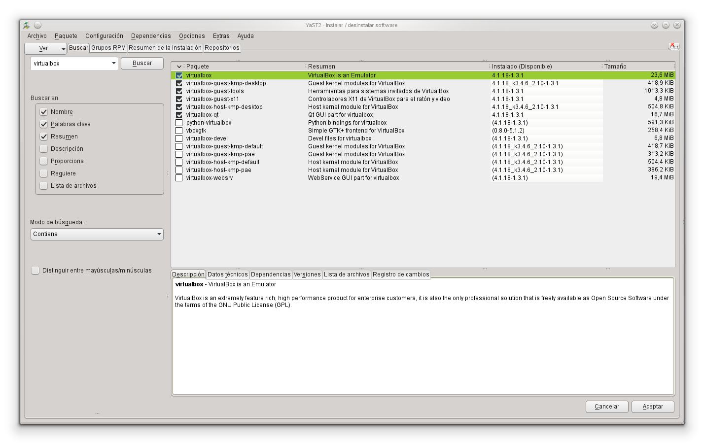 además del paquete como es natural propone las dependencias, pero en mi caso que tengo escritorio KDE instala vboxgtk y phython-virtualbox que son paquetes necesarios para el escritorio Gnome y Xfce, y KDE necesita virtualbox-qt, por lo que opte por hacer la instalación con el gestor de software de YaST.