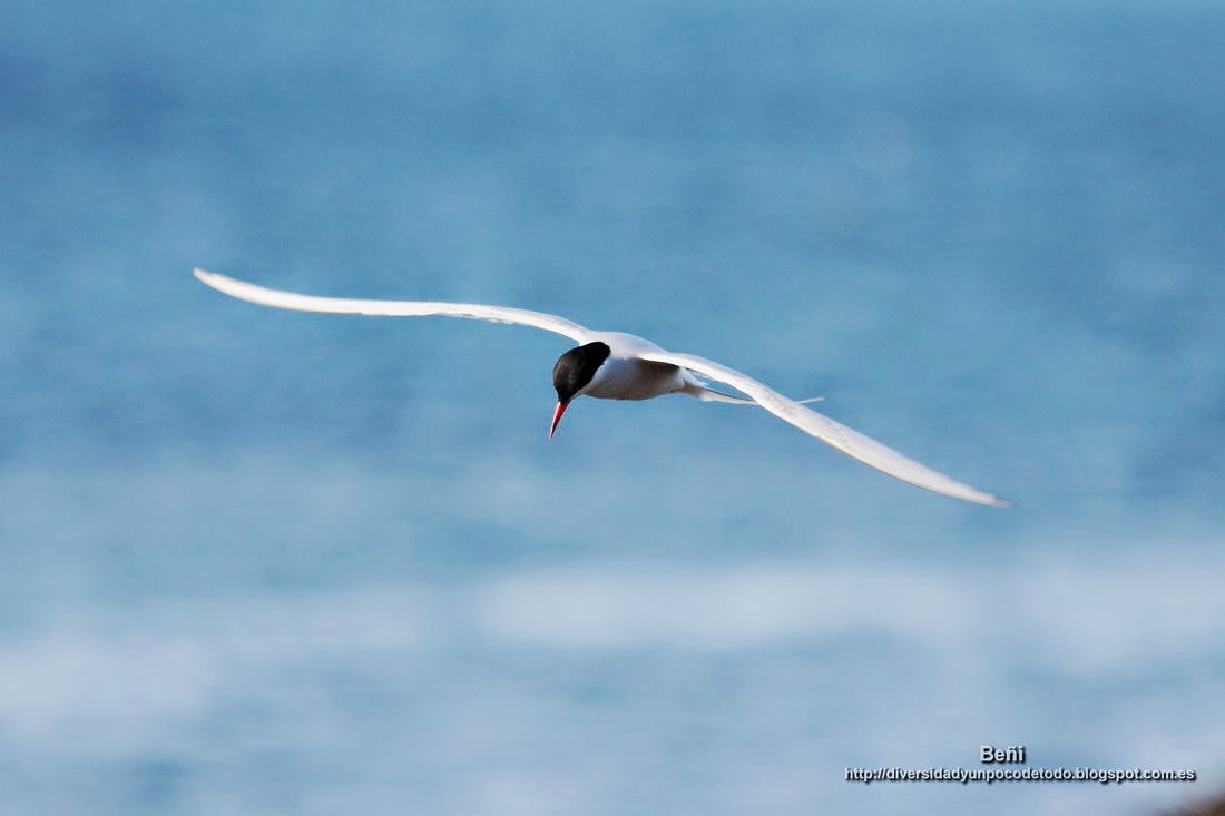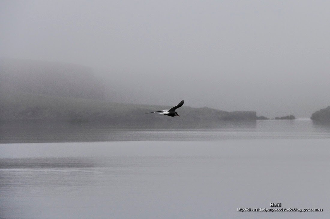 En las rocas había también un grupo de cormoranes. En un momento dado me dí cuenta que un charran ártico estaba planeando junto al acantilado en el que yo estaba, miraba hacia abajo y descendía como una flecha a capturar algún pez. Esto, el capuzón, la verdad que no lo podía ver; me tapaba el acantilado. Pero le pude hacer alguna buena fotografía mientras planeaba (algunas están disponibles como fondos de pantalla).