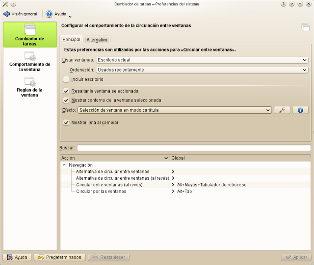 En la versión 4.9 de KDE hay algunos cambios pero que no afectan al procedimiento: La apariencia de la ventana “Cambiador de tareas” es ligeramente distinta sobre todo en la definición de la combinación de teclas que aparecen como botones. En cuanto a las distintas posibilidades de Alt+Tab hay nueve pero en realidad no es que haya más que en la versión 4.8. Presenta las ventanas no está, en realidad como decía no tiene mucho sentido. Conmutador de diseño no aparece como tal sino que en el desplegable entramos directamente en las 6 opciones – creo que son las mismas- y una más, Rejilla. Carátula y cascada están y realmente son las que utilizo también en esta versión 4.9 que la tengo en Kubuntu 12.04.