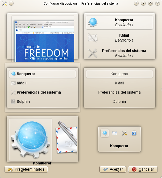En la versión 4.9 de KDE hay algunos cambios pero que no afectan al procedimiento: La apariencia de la ventana “Cambiador de tareas” es ligeramente distinta sobre todo en la definición de la combinación de teclas que aparecen como botones. En cuanto a las distintas posibilidades de Alt+Tab hay nueve pero en realidad no es que haya más que en la versión 4.8. Presenta las ventanas no está, en realidad como decía no tiene mucho sentido. Conmutador de diseño no aparece como tal sino que en el desplegable entramos directamente en las 6 opciones – creo que son las mismas- y una más, Rejilla. Carátula y cascada están y realmente son las que utilizo también en esta versión 4.9 que la tengo en Kubuntu 12.04.