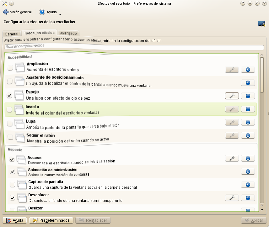 Algunos de los efectos del grupo “Accesibilidad” para activarse utilizan la misma combinación de teclas por lo que si activas uno tienes que desactivar el otro. Este es el caso de Ampliación, Espejo y Lupa, que se activan, ampliando el efecto, con Meta+=, pero ten en cuenta que para = tienes que presionar también la tecla de mayúsculas. Espejo distorsiona el plano, actívalo es resultón, y Lupa puede venir bien en algún momento a “cegarrutos” como yo. Asistente de posicionamiento puede ser práctico pero llega a cansarme.