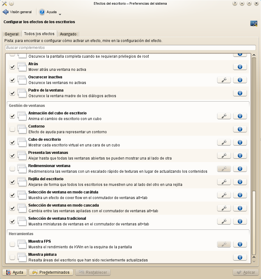 Los dos que aparecen en el grupo «Herramientas» aunque no recuerdo exactamente haberlos utilizado me suena haber tenido algún problema en el pasado. Y, precisamente escribiendo este párrafo, los he activado en la versión 4.9 de KDE y no se cual de ellos pero me ha desconfigurado algunos efectos y el sistema me ha hecho “cosas raras”; afortunadamente tomo precauciones y he restaurado la situación anterior rápidamente; probablemente sea un error que pronto solucionaran. En la versíón 4.8 los he activado sin problemas. Muestra pintura, que resalta áreas del escritorio que han sido recientemente actualizadas, colorea todo el escritorio y las ventanas, resulta desagradable; imagino que es sólo para hacer un chequeo puntual. Muestra FPS es un monitor del rendimiento de Kwin que parece interesante; lo voy a dejar activado.