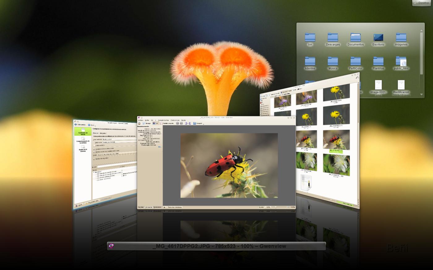 – Presenta las ventanas. Muestra todas las ventanas oscuras en el escritorio menos una iluminada que es la que se selecciona cuando dejamos de presionar Alt+Tab o picamos sobre el escritorio con el ratón. Si abrimos sus herramientas en la ventana inferior vemos que podemos conmutar las ventanas en el escritorio actual con Ctrl+F9 y entre todos los escritorio con Ctrol+F10, y si ejecutamos alguno de ellos nos desplazaremos por las ventanas con el ratón. Usualmente yo utilizó esta opción y no Alt+Tab, además esta acción, como veremos más adelante, la suelo lanzar con el “Borde de pantalla”.
