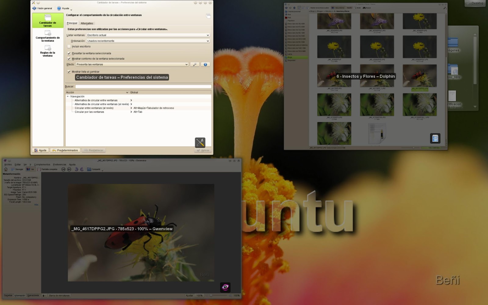 Ahora bien, como ya hemos visto, para que funcionen tienen que estar activados en “Efectos de escritorio”: Rejilla de ventana (a), Presentación de ventana (b, c y d) y Cubo de escritorio (e).