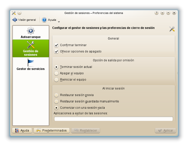 En la ventana que se abre vamos a “Gestión de sesiones” en el tercer bloque a la derecha “Al iniciar sesión” por defecto está marcado “Restaurar sesión previa” pero yo prefiero marcar “Comenzar con una sesión vacía”, cundo termino lo cierro todo, he terminado; además contribuye a que el sistema arranque más rápidamente.