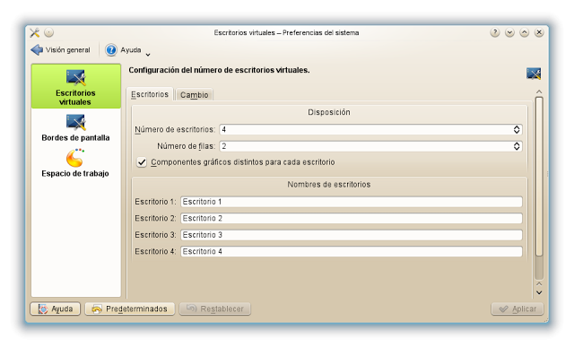 Hola amigo! Felicidades por estos magníficos tutoriales. A mi en "Escritorios virtuales" no me sale la opción "Componentes gráficos distintos para cada escritorio" x lo q no puedo personalizar los mismos. Alguna idea? Gracias x adelantado. Tengo la versión última de OpenSuse 42.1 recién descargada de la Web oficial…