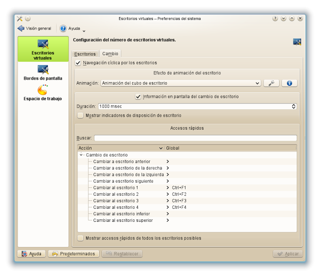 En la pestaña “Cambio” y en “Animación” en el desplegable hay 4 opciones, marco “Animación del cubo de escritorio”, marco también “Información en pantalla del cambio de escritorio” y desmarco “Mostrar indicadores de disposición de escritorio” (no me gusta). Abajo veras en “Cambio de escritorio” “Cambiar al escritorio 1 >Ctrl+F1 y sucesivos. Esto se establece por defecto. En definitiva podrás cambiar de escritorio con las teclas Ctrl+F1 o F2 o F3 o F4. No obstante, podrás cambiar también girando la rueda del ratón.