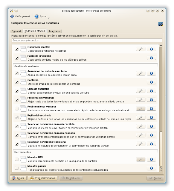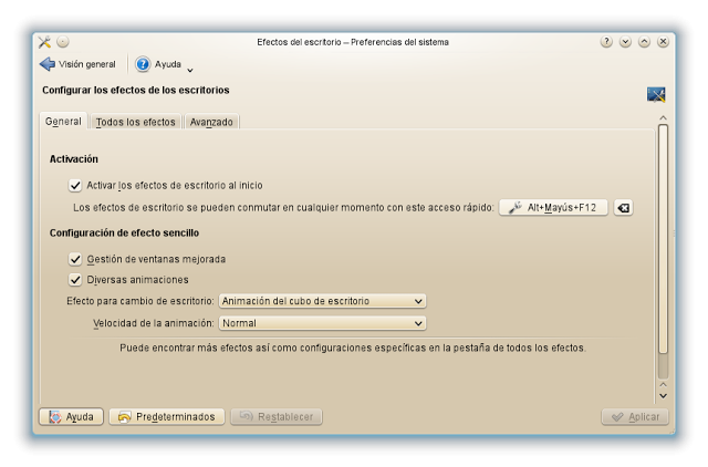 Seguidamente sin salir de Preferencias del sistema vamos a “Efectos de escritorio” a la pestaña “General”, marcamos, si es que no lo está ya, “Activar los efectos de escritorio”. Debajo en “Configuración de efecto sencillo” marcamos “Gestión de ventanas mejorado”, “Diversas animaciones”, y en “Efecto para cambio de escritorio” en el desplegable seleccionamos “Animación de cubo de escritorio. En Velocidad de la animación suelo utilizar “Normal”. Picamos en “Aplicar”.