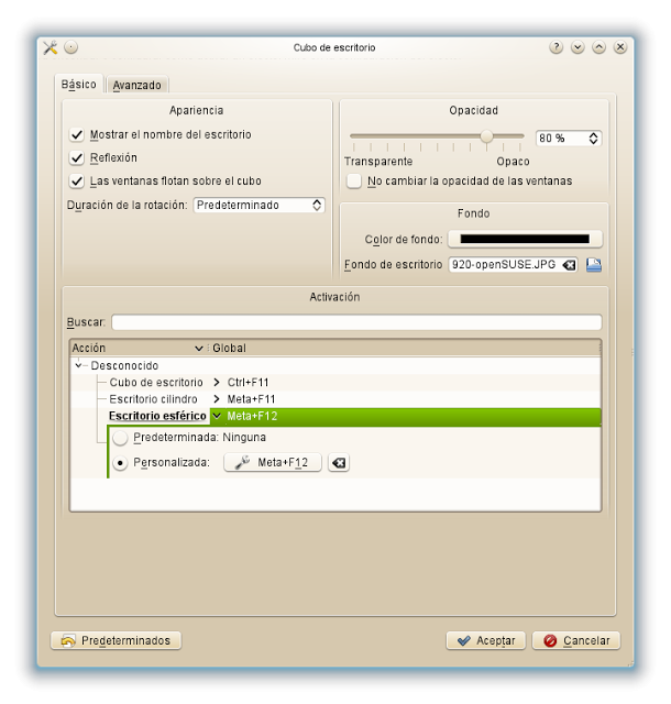 Seguimos en Gestión de ventanas, marcamos “Cubo de escritorio”. Vamos a sus herramientas, en la ventana “Básico” marco “Mostrar el nombre del escritorio”, “Reflexión” y “Las ventanas flotan sobre el cubo”. En “Opacidad” dejo el 80%. Fondo podemos dejar un color, el negro por defecto, o poner una imagen. Picamos en el símbolo de carpeta y navegamos hasta el directorio donde se encuentre nuestra imagen. En “Acción” por defecto “Cubo de escritorio” se activa con Ctrl+F11, esto no obstante, realmente no es muy operativo, podremos mover el cubo, girarlo en todos los sentidos, pero no acceder a las ventanas que tengamos abiertas, pero si al escritorio que lo podemos seleccionar con la combinación de teclas o presionando el botón derecho del ratón. Es fundamentalmente un artificio, pero me gusta. También podemos definir la combinación de teclas para activar el escritorio cilíndrico y el esférico. Picamos en “Escritorio cilíndrico”, “Personalizado” y en el botón de herramientas presionamos las teclas, por ejemplo, Meta+F11. La tecla Ctrl está ya pillada con muchas acciones y tendrías que deshabilitarlas para poder usarla. Así que Meta, que es la tecla que lleva el símbolo de Windows; le damos una utilidad. Para el escritorio esférico actuamos de igual forma y le asignamos, por ejemplo, Meta+F12.