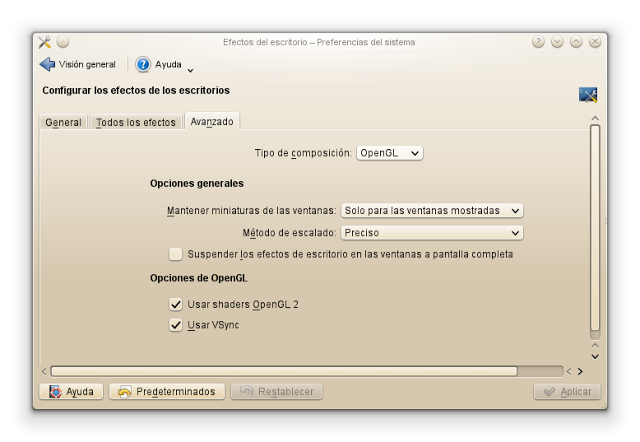 Finalmente vamos a la tercera pestaña en “Tipo de composición” en el desplegable selecciono “OpenGL”, que generalmente está por defecto igual que en “Sistema de Qt” está “Rasterizado”; cuando he seleccionado XRender no funcionan los efectos de escritorio, esto ocurre al menos con mi equipo.