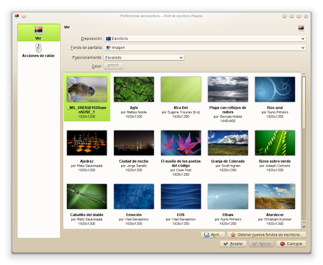 Poner un fondo de escritorio distinto en cada uno de los cuatro escritorios virtuales ayuda a diferenciar “áreas de trabajo” lo que resulta muy conveniente cuando tienes muchas aplicaciones abiertas y distribuidas por categorías en los diferentes escritorios. Para poner o cambiar un fondo de escritorio picas en “Desktop” (extremo superior derecho) o botón derecho sobre el escritorio y, en ambos casos, seleccionas “Preferencias de escritorio”. Puedes seleccionar las imágenes que vienen con la distribución, también puedes “Obtener nuevos fondos de escritorio” picando sobre el botón correspondiente, o seleccionar imágenes desde tu equipo picando en “Abrir” y dirigirte con el navegador al directorio donde las tengas. En este blog tenemos algunos fondos de escritorio que quizás te puedan interesar.