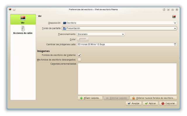 Podemos seleccionar alternativamente a un imagen una presentación de imágenes. En esta misma ventana arriba por defecto en “Fondo de pantalla” está seleccionado “Imagen”, pero con el desplegable seleccionamos presentación, en la ventana que se abre abajo picamos en “Añadir carpeta” y navegamos para seleccionar la que contiene las imágenes; Aceptar. Podemos también seleccionar el tiempo que estará expuesta cada imagen en “Cambiar las imágenes cada …”. Finalmente Aplicar y Aceptar.