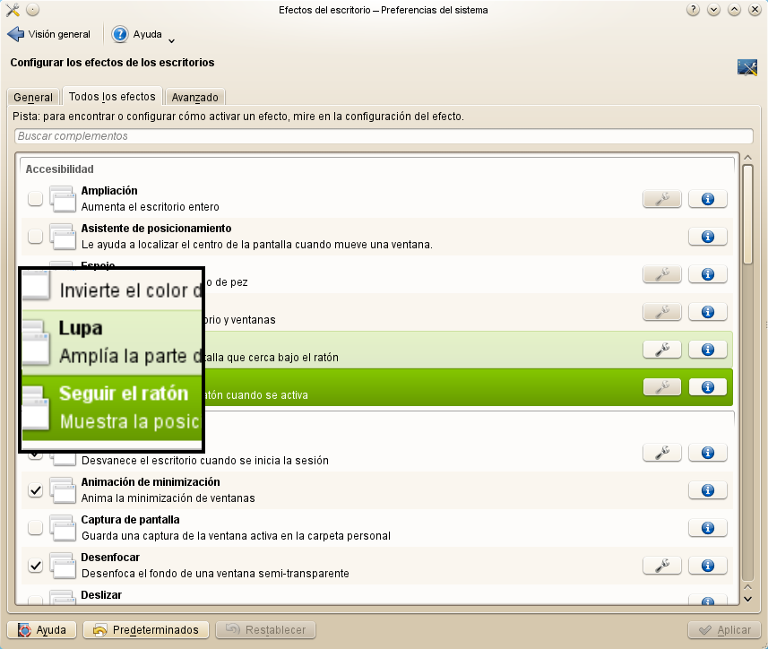 Si has seguido la guía por el modulo de “Efectos de escritorio” hemos pasado ya varias veces por lo que nos debe ser ya muy familiar, particularmente el contenido de “Todos los efectos”. Realmente hay muchos y si soy sincero algunos aún no los conozco porque nunca los he usado o no les he prestado atención. Algunos efectos no son del todo prácticos, más bien artificios: Unos simplemente no me gustan, o me ponen de los nervios cuando los tengo activos de forma continuada, y otros me encantan. Bueno, para gustos los colores; prueba y elige. No obstante, haremos un pequeño repaso destacando algunos aspectos que creo pueden ser de interés.