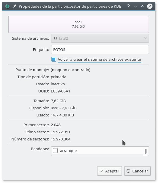 Seleccionamos la unidad donde está la partición que queremos etiquetar (o en su caso renombrar) en la ventana Dispositivo; por ejemplo /dev/sde. Picamos sobre la partición en la ventana Principal, botón derecho y “Propiedades”. Aquí en “Etiqueta”, escribimos el nombre que queremos dar (FOTOS, por ejemplo, y picamos en “OK”.