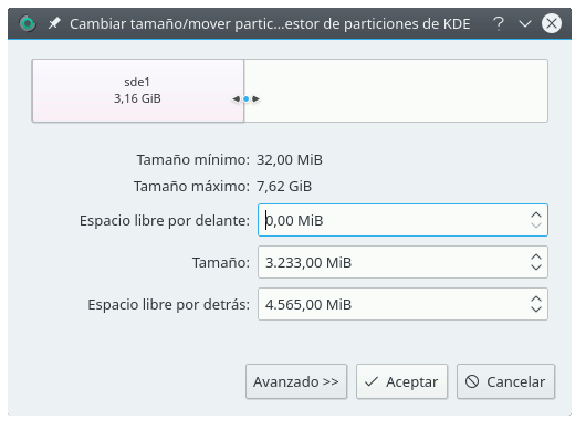 Alternativamente, podemos también fijar el tamaño de la primera partición dando un valor en “Size”, y picamos dentro del cajetin de “Espacio libre posterior” y se calcula el espacio que quedará para la segunda partición. Picamos en OK