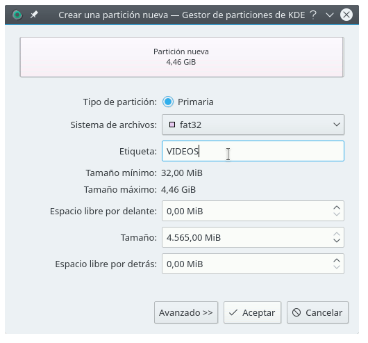 Botón derecho sobre ella y picamos en “Nueva”. Seleccionamos el “Sistema de archivos”, FAT32, por ejemplo. Escribimos una etiqueta (VIDEOS) y “OK”. Y “Aplicar”.