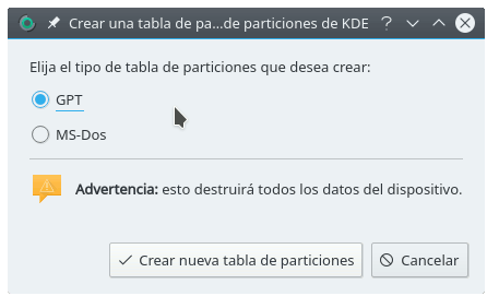 Ahora crearemos las dos particiones pero utilizando “Nueva tabla de particiones” que está en la segunda fila de herramientas. Tenemos dos opciones: GPT con la que podremos crear un gran número de particiones; y MS-Dos que nos permite sólo 4 particiones y una extendida con un cierto número de particiones lógicas. Para un caso como el presente yo creo que nos da igual. Usaremos GPT que es la que aparece por defecto, y, además, es la más moderna. Picamos, seguidamente, en “Crear una nueva tabla de particiones”.