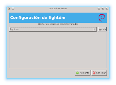 Durante la instalación nos preguntará que gestor de sesiones queremos tener predefinido, el que ya teníamos según el escritorio o LightDM. Parece lógico que si hemos instalado LightDM seleccionemos este. Si la instalación la haces mediante Synaptic te aparece un asistente como el siguiente, picas en el desplegable y seleccionas lightdm y “Adelante”.