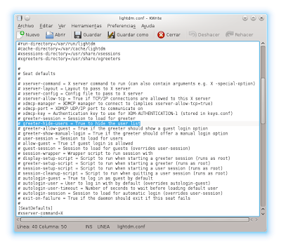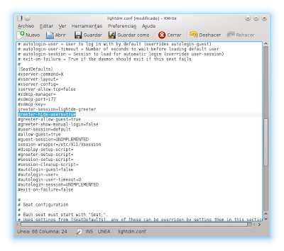O también, y si utilizamos KDE, mediante Dolphin con privilegios de root y KWriter (para más detalles sobre este procedimiento aquí) que es como usualmente yo edito los archivos de configuración. Sea como sea, una vez abierto cualquiera de los dos archivos, lightdm.conf por ejemplo, vamos a determinadas líneas para modificar lo pertinente. En este caso, al abrir el fichero encontramos un bloque de texto titulado “Seat defaults” que ofrece una explicación sobre los distintos parámetros que se pueden configurar. Los valores de los parámetros los tenemos que cambiar en el siguiente bloque de texto “SeatDefaults”; y eliminando el símbolo # al principio de la línea, o, lo que es lo mismo, descomentando la línea.