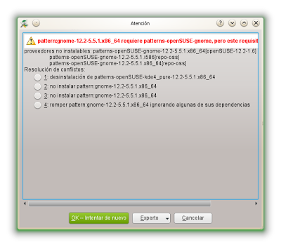 Al instalar Gnome teniendo KDE, y quiero recordar que también al instalar XFCE con anterioridad, sale un mensaje de conflicto “Atención”. Tenemos que marcar de las 4 opciones de resolución de conflicto la primera que dice: