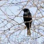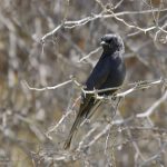 El papamoscas sudafricano es de plumaje completamente negro y tiene 19-22 cm y 21-33 g de peso.