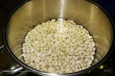 Las judías las ponemos el día anterior en agua para que se hidraten. Si el agua de tu localidad es muy alcalina, como es el caso de la ciudad de Murcia, utilizaremos agua mineral o de depuradora de hogar tanto para mantenerlas en remojo como para poner en la olla.