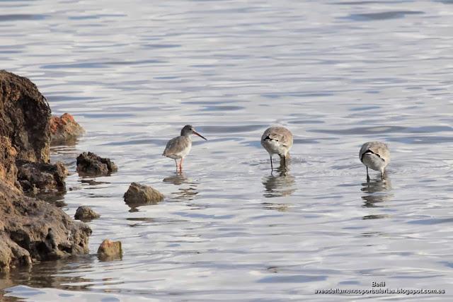 | Archibebe común y dos ejemplares de aguja colinegra. |