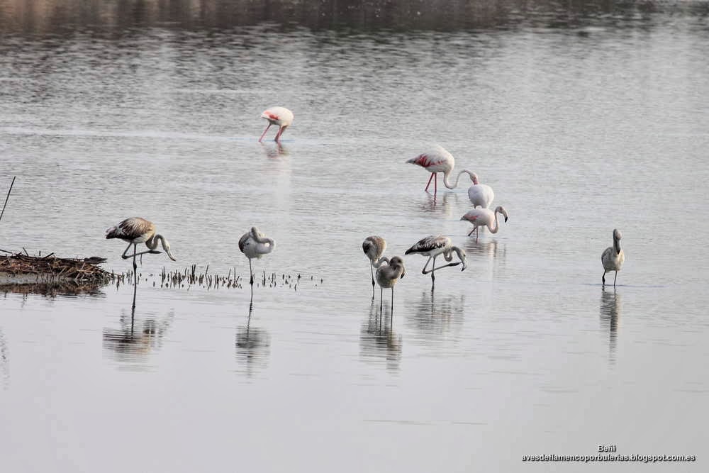 Especies: Aguja colinegra (Limosa limosa), Ánade real o azulón (Anas platyrhynchos) archibebe claro (Tringa nebularia), archibebe común (Tringa totanus), avoceta común (Recurvirostra avosetta), cigüeñuela común (Himantopus himantopus), flamenco rosado (Phoenicopterus roseus), garceta común (Egretta garzetta), zampullín cuellinegro (Podiceps nigricollis).