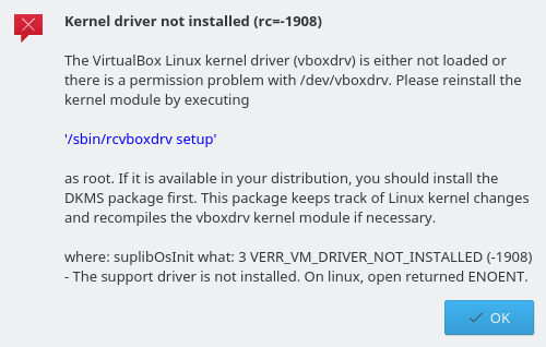 Encontré diversas soluciones, que por lo general hacen referencia al comando “rcvboxdrv setup” pero el archivo está localizado en otro directorio, y/o la reinstalación de virtulbox y/o virtualbox-dkms. Estas reinstalaciones no afectan a la configuración de las máquinas virtuales que tengamos instaladas, por lo que no hay que preocuparse.